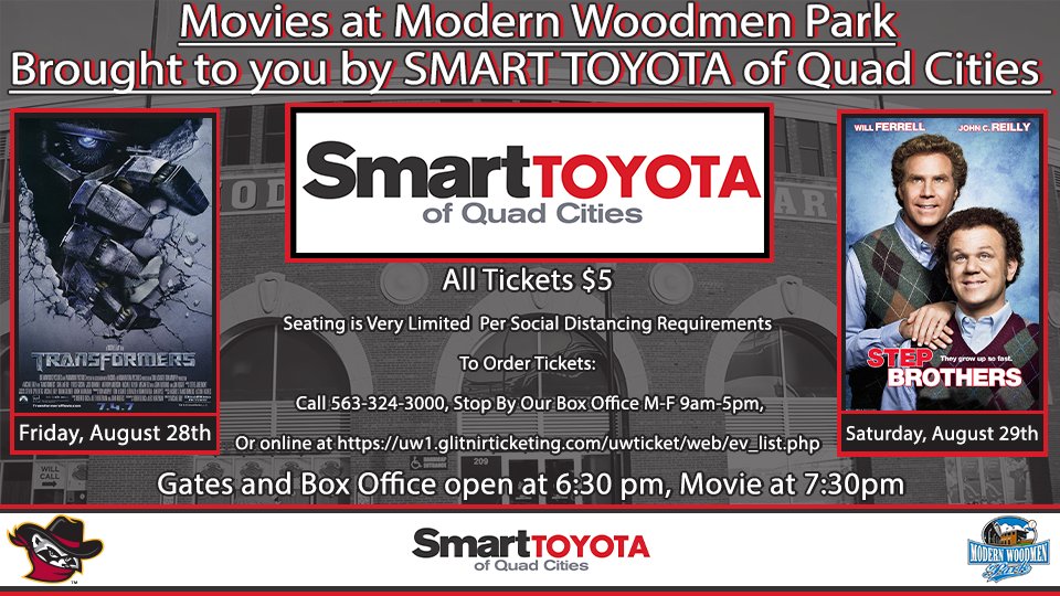 The Quad Cities River Bandits will be showing classic movie titles at Modern Woodmen Park for select dates now through the end of September. All tickets for “Movies at Modern Woodmen Park” will be just $5 and all the proceeds from ticket sales will go to the Genesis Health Services Foundation. Movie seating will be in our seating bowl at 10% capacity and all seating locations will be socially distanced. Tickets can be purchased at our box office Monday through Friday from 9am-5pm, by calling our main office line at 563-324-3000 or online at the this link: https://uw1.glitnirticketing.com/uwticket/web/ev_list.php